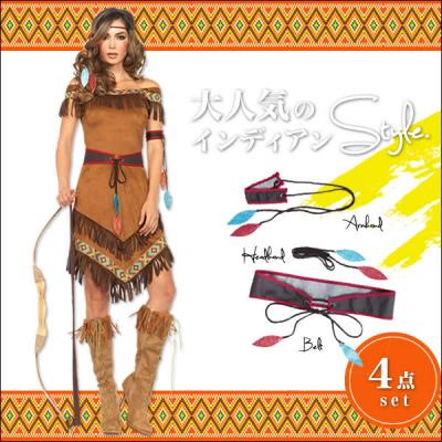 ポカホンタス風ネイティブコスチュームドレス4点セットです★☆セット内容☆ドレスベルトアームバンドヘッドバンド★下記商品はセット対象外です★弓ブーツ